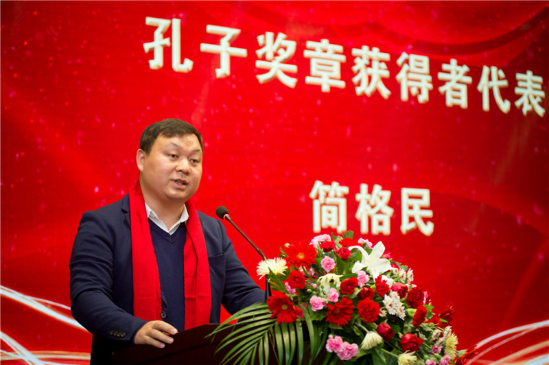 孔子奖章获得者简格民代表孔子奖章获得者发言。