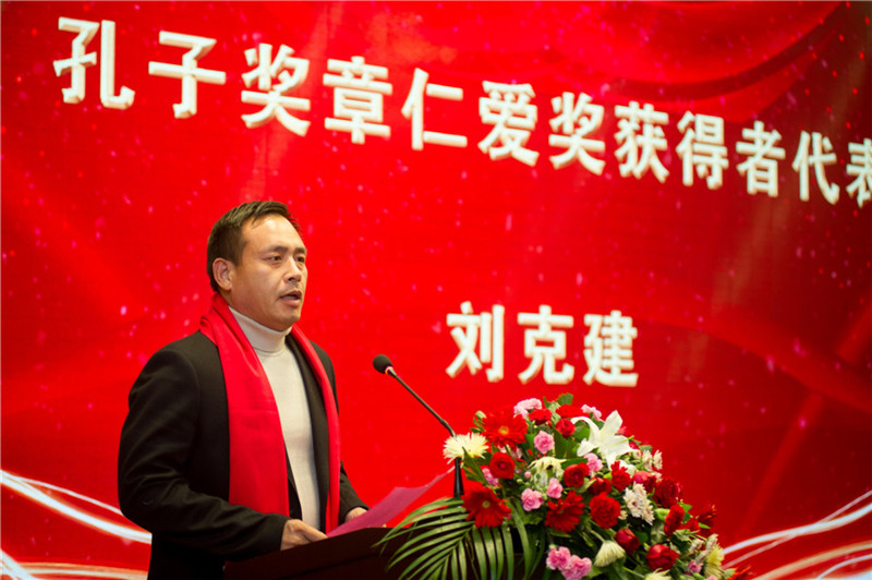 山东省东营市橄榄树公益事业发展中心负责人刘克建在代表仁爱奖评选活动获奖者发言时表示,“我曾经是一名军人,每个军人都渴望获得一枚军功章。而如今转业多年的我在从事公益慈善事业后,有幸获得孔子奖章仁爱奖奖章,我觉得这就是社会给我的一枚‘军功章’。我定当‘不忘初心,牢记使命’把孔子仁爱精神弘扬和传递下去,并在今后的工作生活中更好的履行一个仁爱奖获得者的榜样职责,同时也号召身边更多人学习优秀传统文化、学习各位孔子奖章获奖者的卓越精神”。