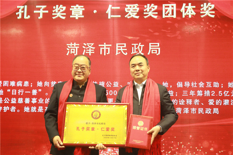 经孔子奖章组织委员会秘书长常务会议批准,决定授予菏泽市民政局、济南市机关医院两个单位,江苏抗疫英雄、长江学者、南京师范大学环境学院副院长、博士生导师王凤贺,云南锺贤航空服务有限责任公司董事长郭绍贤,全国工商联医药商会工业商会副会长张丰三位个人孔子奖章·仁爱奖;授予北京齐物千鸿书画院院长孔祥允孔子奖章·文化奖。决定颁发山东童善儿童福利公益发展中心主任李晓孔子奖章荣誉证书。